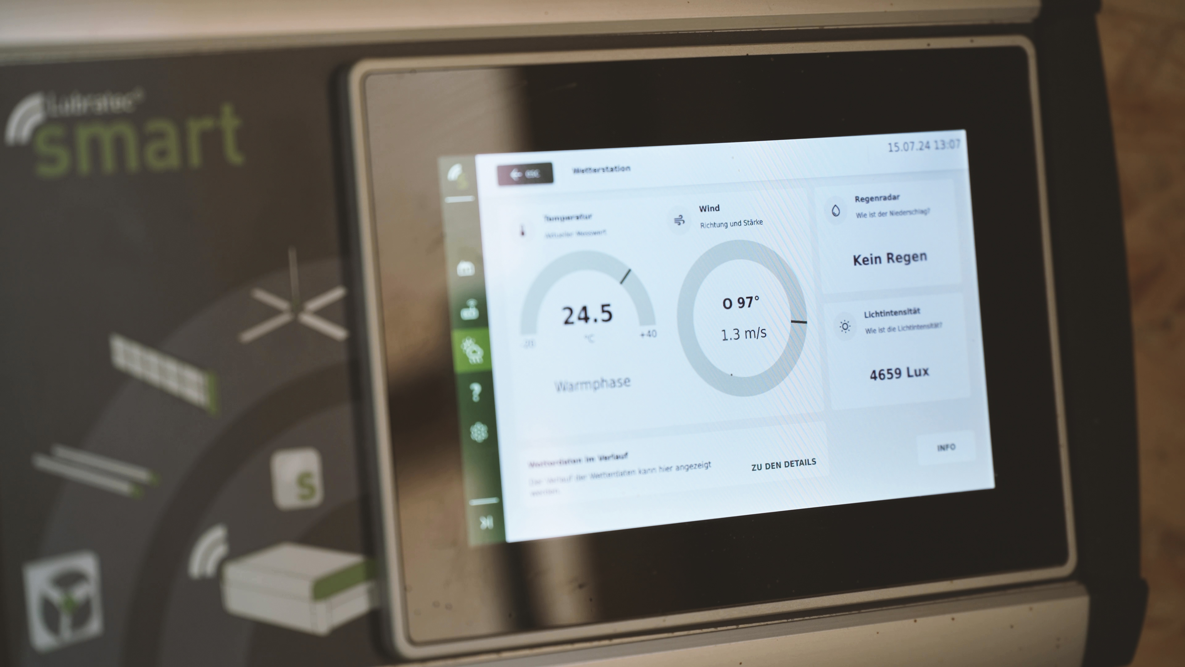 In alle drie de klimaatfasen zorgt Lubratec Smart voor een perfect samenspel van ventilatie, ventilatoren en optionele bevochtiging. De basis hiervoor is de continue registratie van relevante omgevingsinvloeden zoals temperatuur, windrichting en -sterkte, neerslag, luchtvochtigheid, schadelijke gassen (vooral CO₂) en lichtomstandigheden. Lokale weergegevens en het verloop ervan worden ook geregistreerd via een speciaal weerstation, zodat alle aangesloten Lubratec stalklimaatproducten proactief en bijzonder efficiënt kunnen worden geregeld. Het LED-lichtniveau wordt geregeld via vrij definieerbare tijdprogramma's (bijv. 16 uur licht / 8 uur donker, omgekeerd voor droge koeien), inclusief nachtmodus. Als er buiten voldoende licht is, schakelt het licht automatisch uit en wordt er energie bespaard. Het in- en uitschakelen gebeurt altijd gedimd en diervriendelijk om stress te voorkomen.