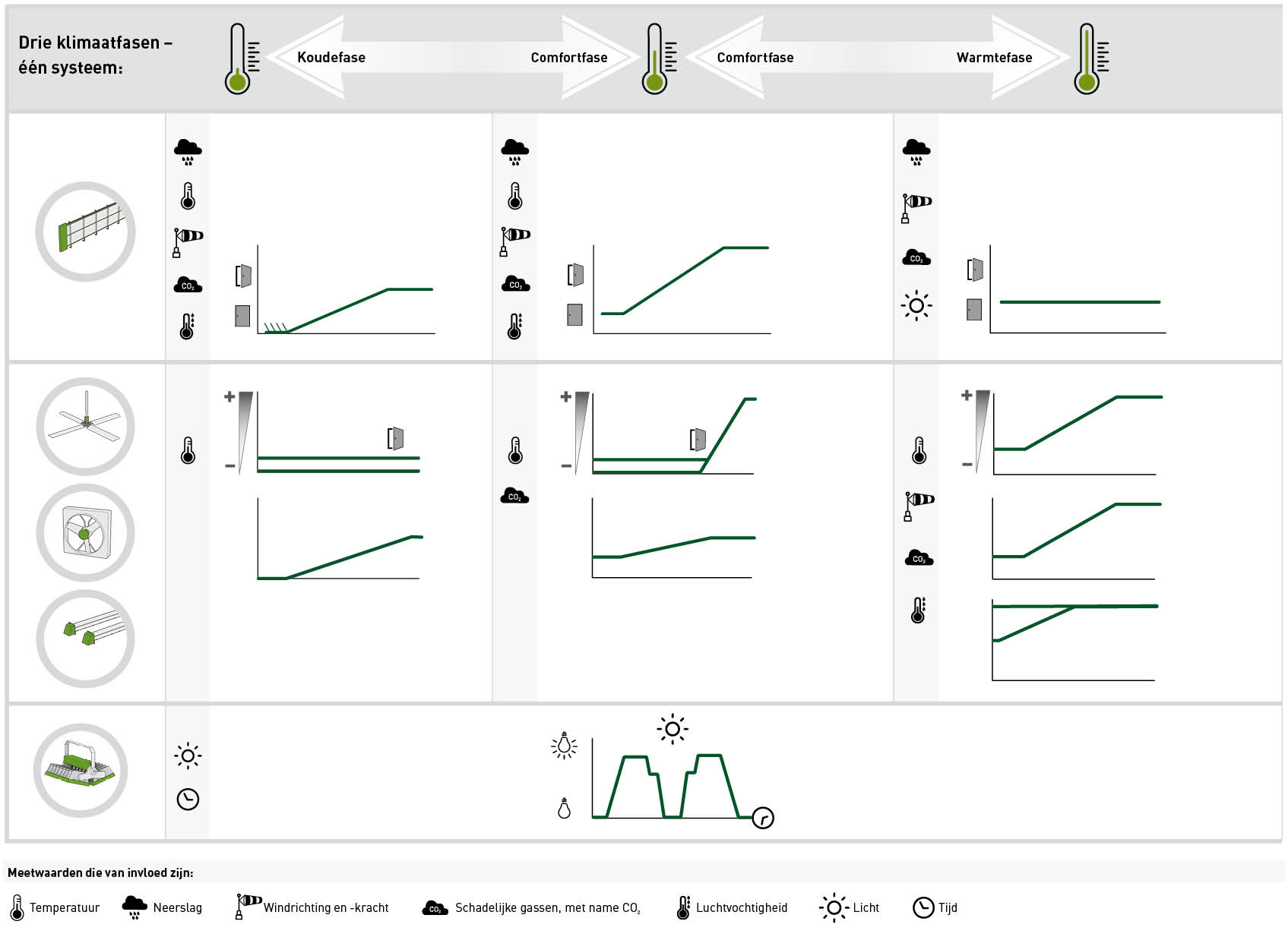 In de warme fase ligt de nadruk op het verminderen van hittestress. Windventilatie en ventilatoren worden gericht ingezet om de staltemperatuur te verlagen. Bij intense hitte wordt het afkoelingseffect benut door het gecombineerde gebruik van ventilatoren en verneveling om de dieren merkbaar te ontlasten.