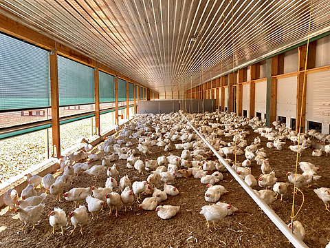 The Knabe family's chicken fattening barn, which has existed since 1997, was retrofitted with a winter garden and outdoor run. Due to the newly created space and the possibility of outdoor access, the barn now meets Naturland's criteria for organic management. The insulated warm housing area with forced ventilation and heating as well as the 70-metre-long winter garden provide space for 14,300 animals. The challenge was to create an uncomplicated transition between the winter garden and the outdoor run.
