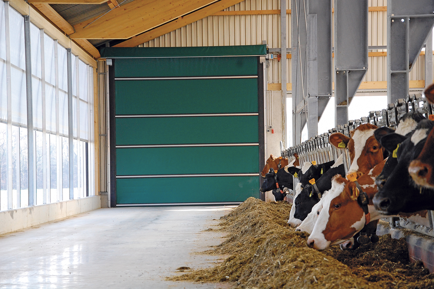 The light ridge uses a round-arch frame and a dim translucent membrane to diffuse daylight widely across the shed. Given that at least half of the intense solar radiation is blocked out, the risk of a greenhouse effect is completely banished. This allows the specification of substantial opening widths between 4 and 7 m to optimize daylighting performance. The result is a cattle house with uniform illumination instead of a brightly lit strip down the middle of the shed. The air flows induced by the slanting wind deflectors guarantee constant turbulence-free extract ventilation. The roll-up ventilation on one of the eaves fronts serves to regulate the air supply while providing excellent wind and weather protection. The selected model opens from the bottom upwards while simultaneously winding two tarpaulins onto a central roller. The Stabidoor can accommodate high wind loads and offers rapid access to the feed table. All three installed products thus perfectly embody the new light and air concept for cubicle cattle houses.