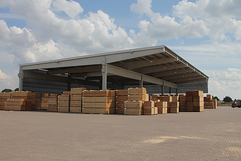 The E. A. Vehmeyer OHG building centre in Haselünne comprises a builders’ merchant outlet and a modern sawmill. As an ideal warehousing solution for the high-grade converted timber products, the client sought a means of combining weather protection with efficient through ventilation and the proper conditions for wood seasoning.